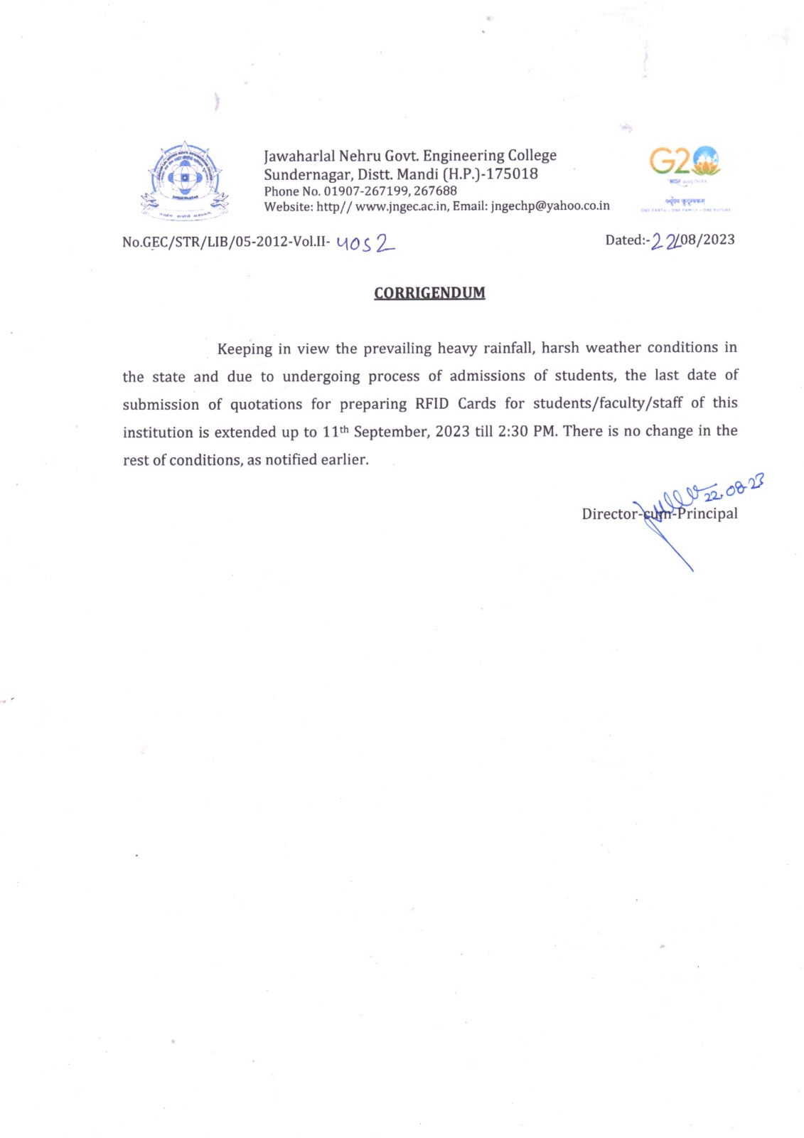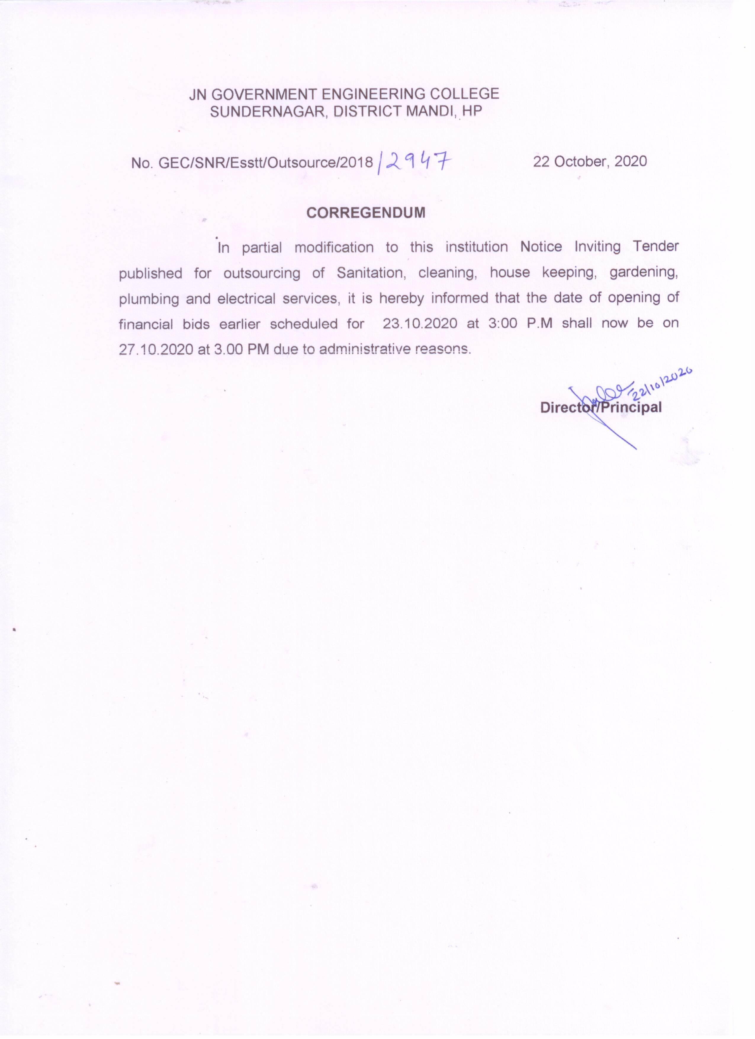 CORRIGENDUM: TENDER DOCUMENT FOR PROVIDING SANITATION & CLEANING, GARDENING ELECTRICAL AND PLUMBING SERVICES. |