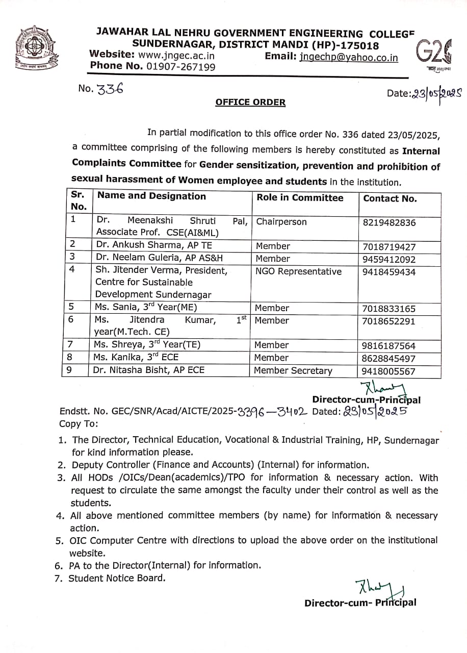 The objectives of the Internal Complaint Committee at J.N. Government Engineering College, Sundernagar includes:
